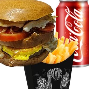 Pão especial brioche Pita Bread, 1 Hambúrguer de Picanha 120gr, dois Ovos, Bacon, Tomate, Alface Americana + Coca cola 350ml +fritas 150gr