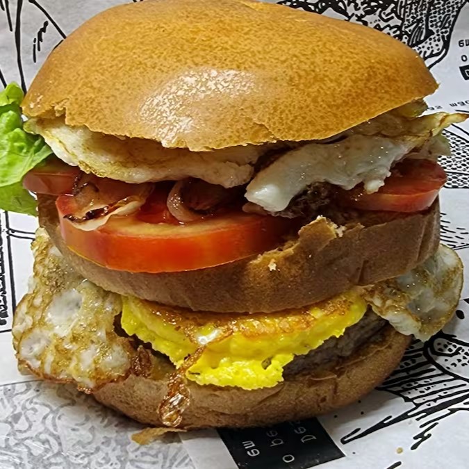 Pão especial brioche Pita Bread, 1 Hambúrguer de Picanha 120gr, dois Ovos, Bacon, Tomate, Alface Americana.