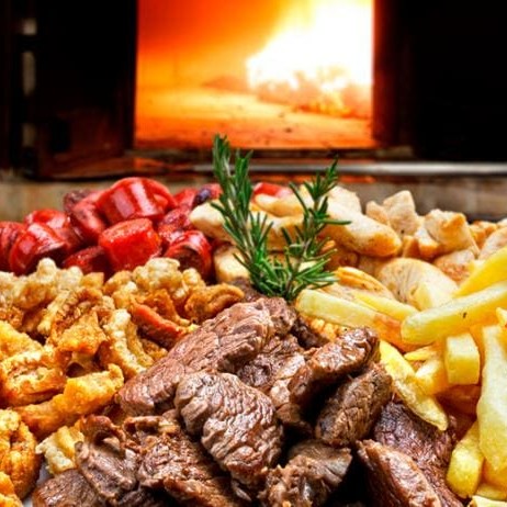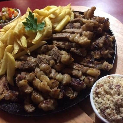 150g de contra filé, 150g de lombo, 80g de linguiça de pernil, 80g de coração, 120g de batata frita, 120g de mandioca frita e 50g de torresmo e cebola