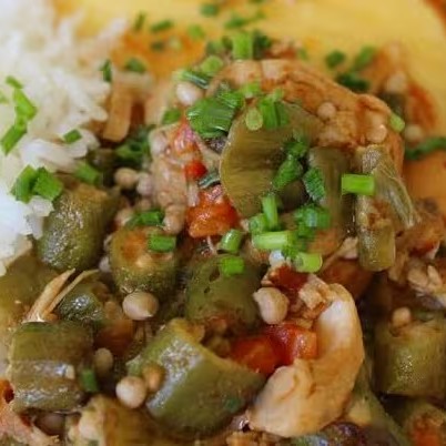 Frango com quiabo (acompanha arroz, feijão e salada de alface e tomate)