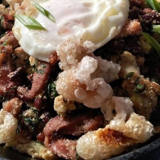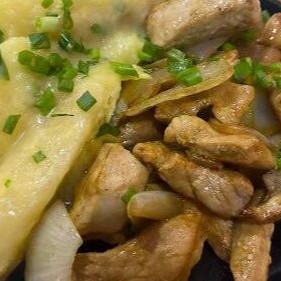 300g de Pernil, 400g de mandioca cozida e finalizada na manteiga de garrafa, finalizado com cebola roxa e cebolinha.