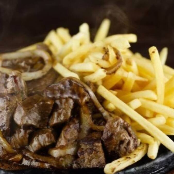 300g de Ancho grill selado e finalizado na manteiga, com cebola e 400g de batata palito frita.