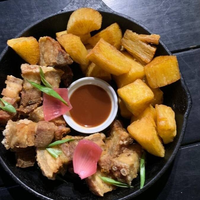 300grs de torresmo de barriga crocante, 400g de mandioca frita e bem sequinha, acompanha cullis de goiabada.