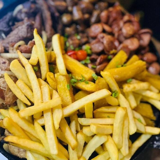 300g pernil, 150g coraçãozinho, 300g picanha, 300g mandioca frita, 300g batata frita,150g linguiça, acompanha farofa e vinagrete