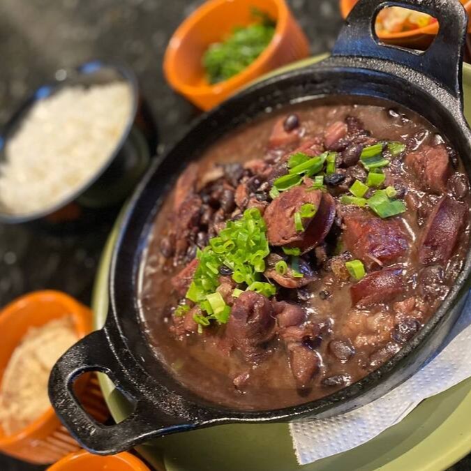 Deliciosa feijoada, acompanha arroz branco, farofa, vinagrete, couve e laranja.
