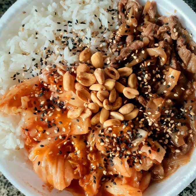 Carne de boi fatiada fina com cebola salteada no shoyu e manteiga, kimchi coreano (conserva picante), arroz branco, amendoim e gergelim. Prato picante coreano com temperos tipicos.