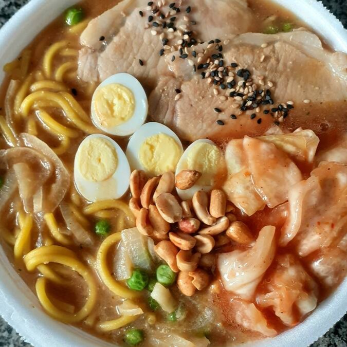 Ramen ou Lámen feito com massa tradicional e caldo picante de missô, shoyu e fundo de carne suína, acompanha ovos de codorna, cebola, ervilha, amendoim crocante, Kimchi coreano picante, lombo suíno marinado em temperos orientais