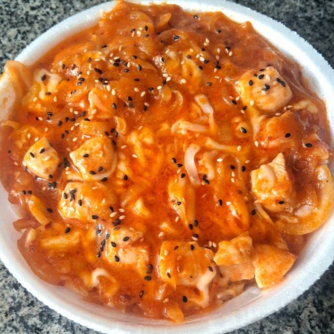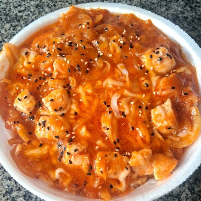 Arroz na base, coberto com frango ao molho com mix de 4 pimentas (gochugaru, páprica picante, páprica defumada e pimenta calabresa), refogadas na cebola, alho e finalizado com mussarela derretida misturada diretamente no molho. Prato levemente agridoce com picância moderada para alta. Acompanha amendoim crocante.