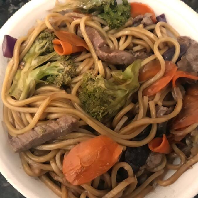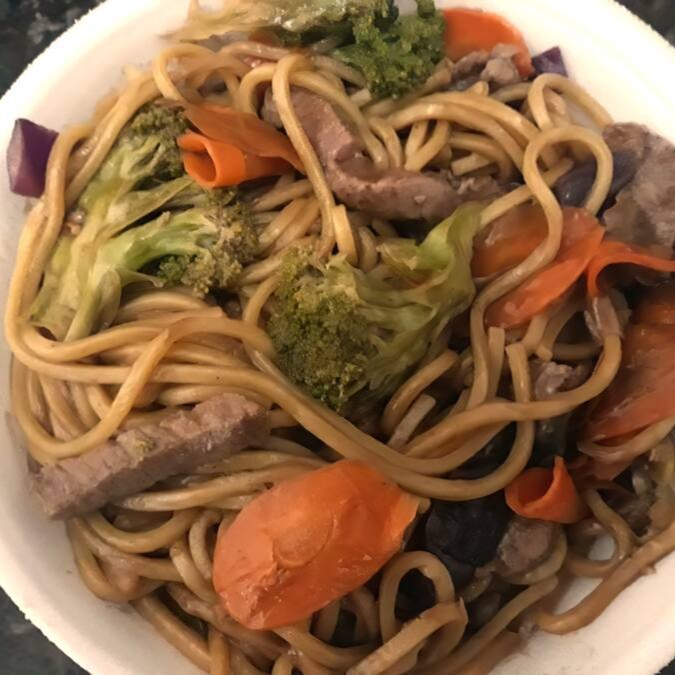 Yakissoba no Marmitex! Massa, brócolis, cenoura, cebola, pimentão, repolho roxo e verde, carne bovina e molho oriental da casa. Acompanha amendoim crocante para adicionar ao prato.