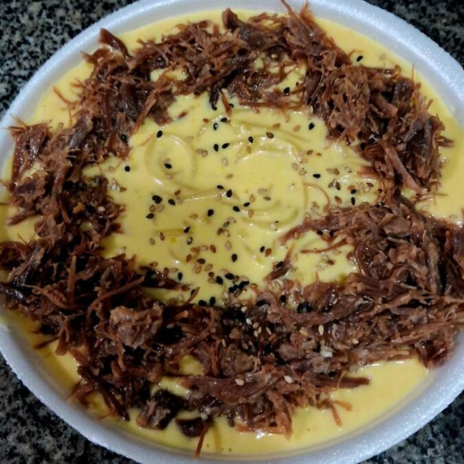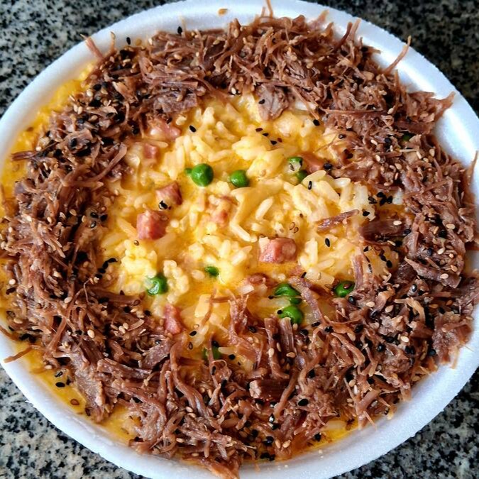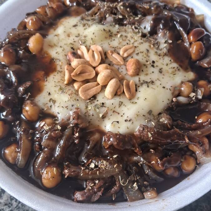 Arroz na base coberto com, contra filé refogado no molho de cebola, alho, grão-de-bico, orégano, com um toque de shoyu e caldo demi-glace. Finalizado com mussarela derretida e orégano por cima. Acompanha amendoim crocante.