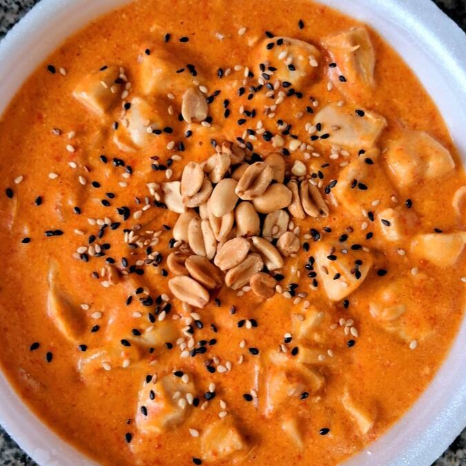 Versão do prato Butter chicken da culinaria indiana. Arroz branco coberto pelo frango na manteiga picante (frango grelhado na manteiga com cebola, páprica, pimenta calabresa, pimenta do reino, tempero de alho, amendoim, gergelim, iogurte e extrato de tomate). Prato picante, caso queira sem pimenta ou com muita pimenta basta pedir nas observações!