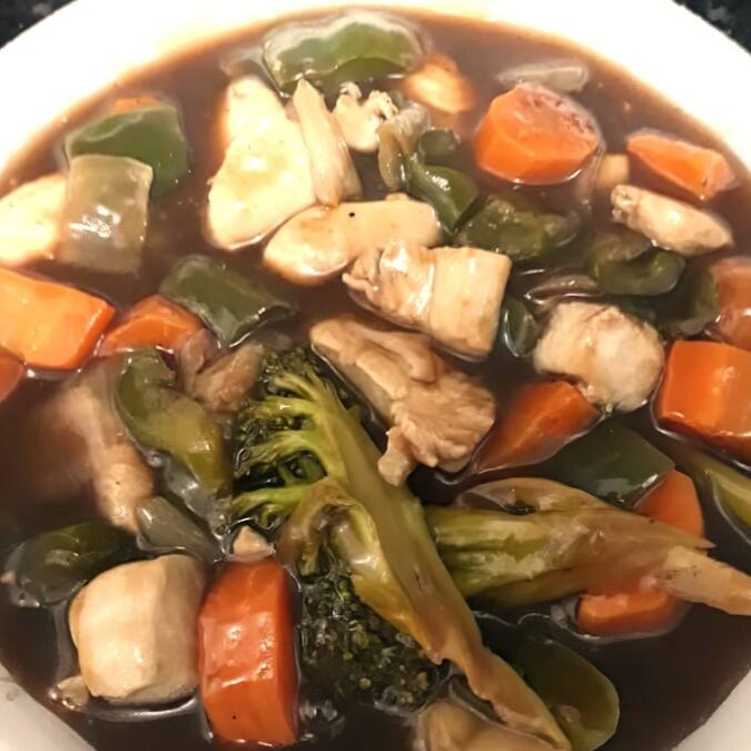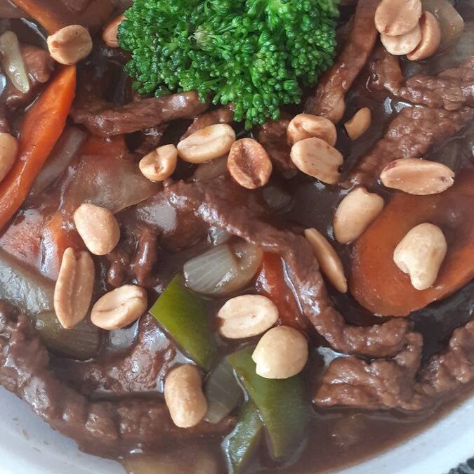 Frango, cebola em cubos, cenoura fatiada, brócolis, pimentão no molho oriental com arroz por baixo. Acompanha amendoim crocante para adicionar ao prato