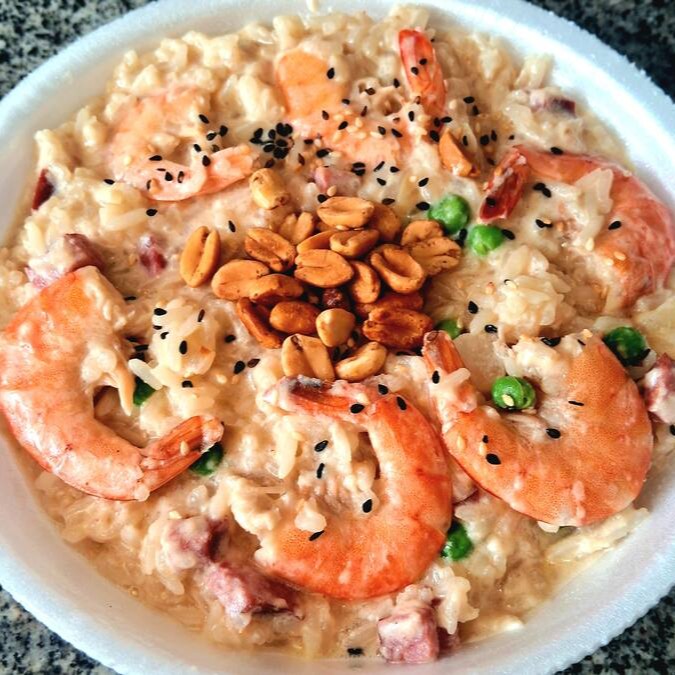 Arroz cremoso com molho de creme de leite, alho, cebola, refogados com camarão (cinza com casca), calabresa defumada, ervilhas frescas e finalizado com manteiga de alho e mussarela. Acompanha amendoim crocante.