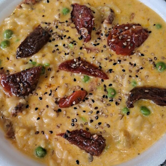 Arroz cremoso com molho de creme de leite, alho, cebola, refogados com tomate seco, calabresa defumada, ervilhas frescas e finalizado com manteiga de alho e mussarela. Acompanha amendoim crocante.