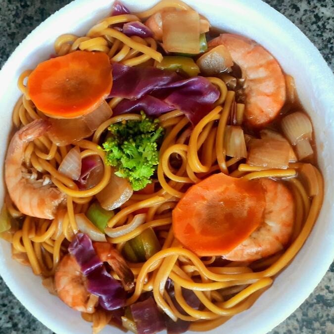 Yakissoba no Marmitex! Massa, brócolis, cenoura, cebola, pimentão, repolho roxo e verde, camarão cinza com casca e molho oriental da casa. Acompanha amendoim crocante para adicionar ao prato.