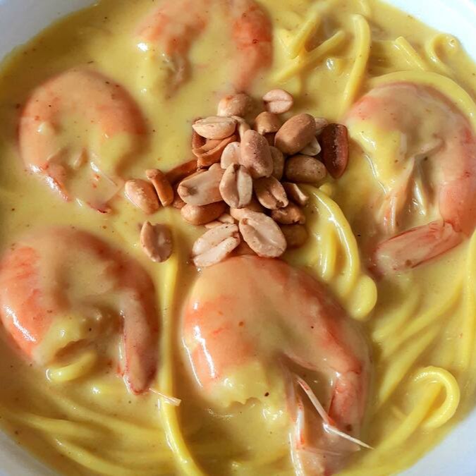 Camarão cinza com casca ao molho cremoso a base de curry, manteiga, alho e creme de leite refogados na massa oriental. Acompanha amendoim para complementar o prato.