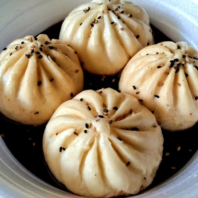 4 unidades de Bao (pãozinho macio de frango desfiado com repolho, cenoura, cebolinha, gengibre e alho) cozidos no vapor. Acompanha molho teriyaki.