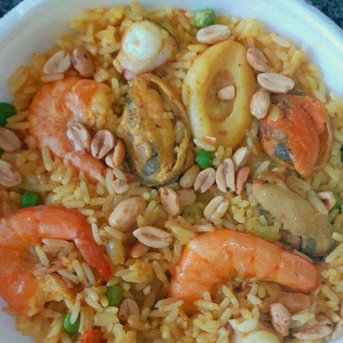 Arroz com cebola, ervilhas, amendoim e muitos frutos do mar (Camarão com casca, Mexilhão, Lula em anéis, Polvo), temperados com curry, paprica defumada e hondashi (tempero a base de peixe).