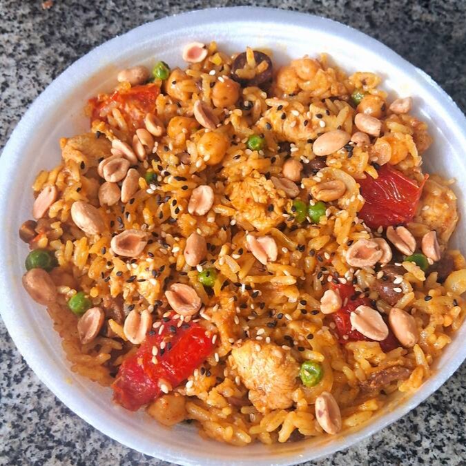 Prato da culinaria indiana com temperos picantes masala (cominho, curry, pimenta do reino, curcuma, pimenta calabresa e urucum). Arroz refogado no masala com cebola, alho, ervilha, grão de bico, azeitona preta, amendoim, gergelim, tomate seco e peito de frango em cubos. Prato com picancia moderada caso queira aumentar ou remover a pimenta basta pedir na descriçao.