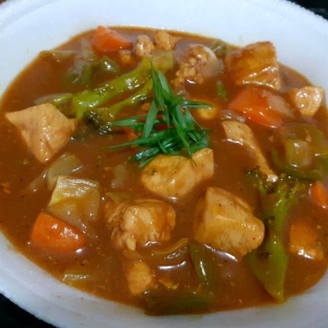 Frango, cebola em cubos, cenoura fatiada, brócolis, pimentao no molho curry ao missô e arroz por baixo. (prato com picância moderada, caso queira retirar ou aumentar a picância, por gentileza pedir na observação do pedido.) Acompanha amendoim crocante para adicionar ao prato.