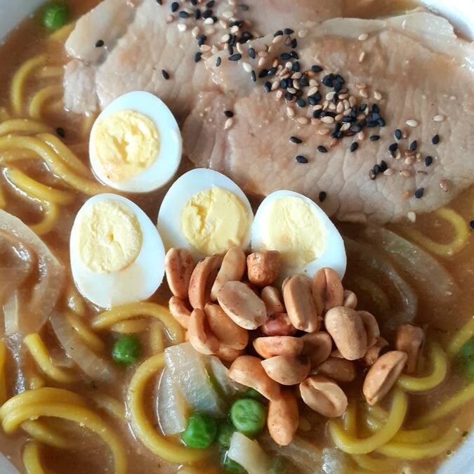 Ramen ou Lámen feito com massa tradicional e caldo de missô, shoyu e fundo de carne suína, acompanha ovos de codorna, cebola, ervilha, amendoim crocante e lombo suíno marinado em temperos orientais