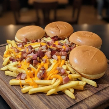 04 Smash Jr (Pão de Brioche, 2x Carne Artesanal 60g, Queijo Cheddar Cremoso e Cebola Caramelizada) + Batata Frita C/ Cheddar e Bacon