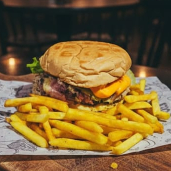 Pão de Brioche Selado na Manteiga, 2x Carne Artesanal 60g, Fatias Crocantes de Bacon, Queijo Cheddar Cremoso, Cebola Caramelizada, Alface Americana, Tomate e Maionese Grill Defumada (Acompanha Batata Frita)