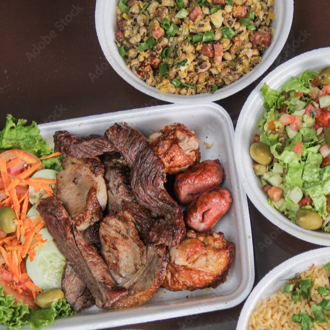 Arroz Branco ao Alho, Feijão Tropeiro com Calabresa e Bacon, Torresmo, Churrasco Misto (Boi, Porco e Linguiça) Salpicão de Frango Desfiado (Enviado separado) Acompanha Sobremesa Grátis