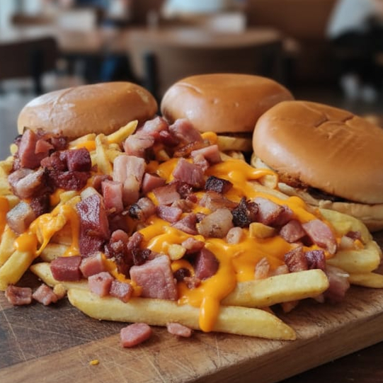 03 Smash Jr (Pão de Brioche, 2x Carne Artesanal 60g, Queijo Cheddar Cremoso e Cebola Caramelizada) + Batata Frita C/ Cheddar e Bacon