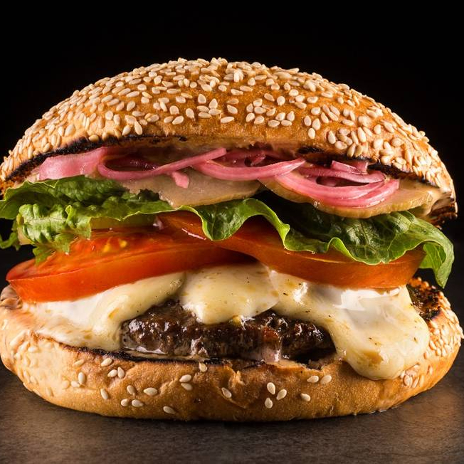Pão Mega Prensado, Fatias crocantes de Bacon, Presunto, Queijo Mussarela, Orégano, Alface, Tomate, Milho, Carne Artesanal 120g e Molho Defumado da Casa. (Acompanha Batata Frita) - (Serve até 2 Pessoas)