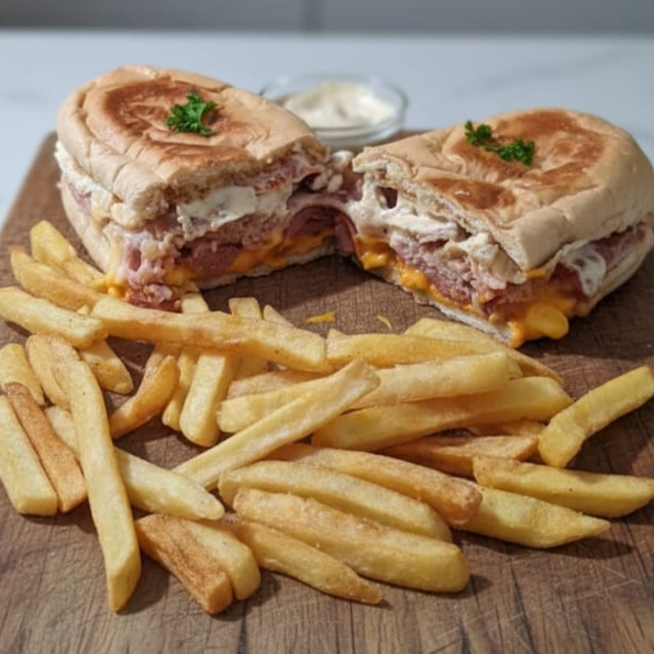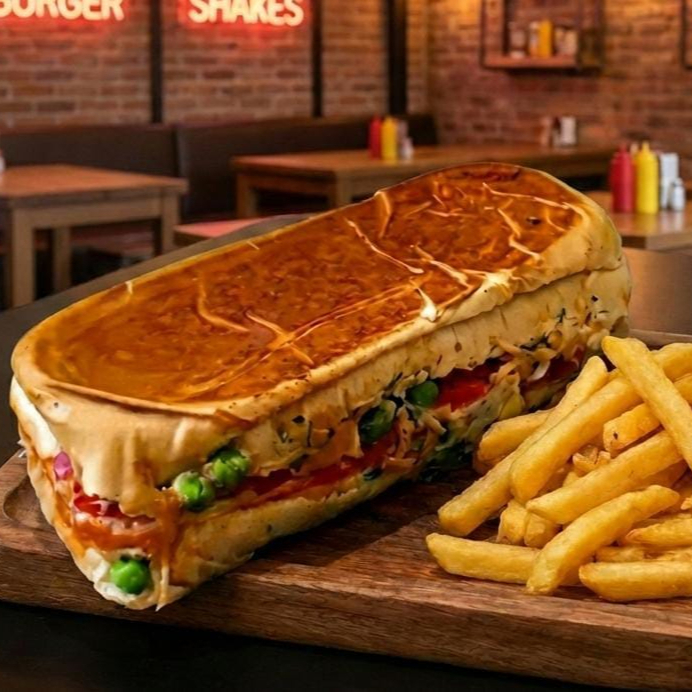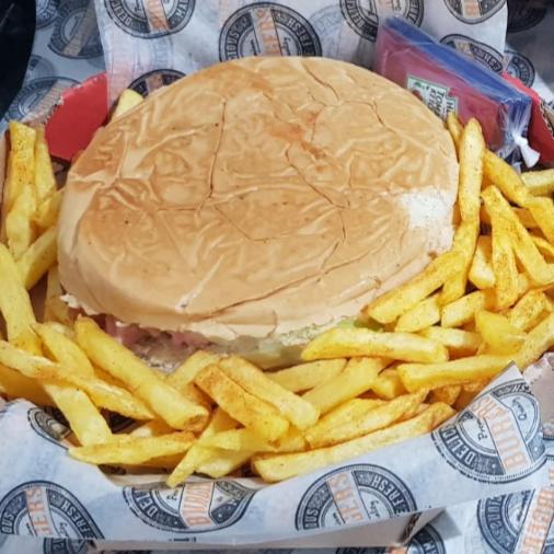 Pão Mega Prensado, Fatias crocantes de Bacon, Presunto, Queijo Mussarela, Orégano, Alface, Tomate, Milho , Carne Artesanal 120g, Ovo, Frango Desfiado, Abacaxi Grelhado e Molho Defumado da Casa. (Acompanha Batata Frita) - (Serve até 2 Pessoas)