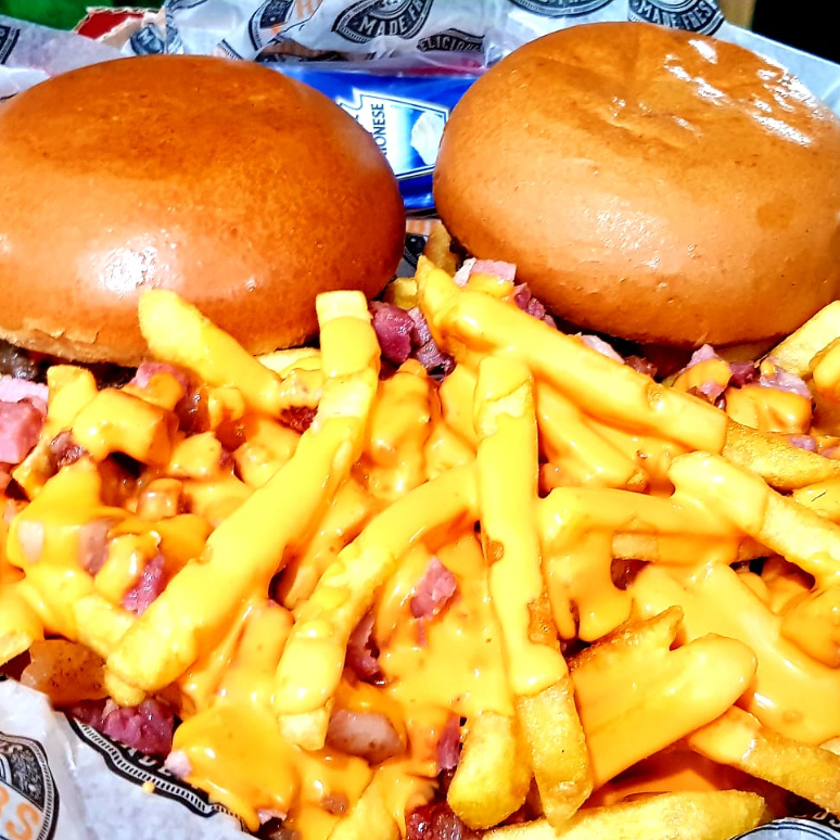 02 Smash Jr (Pão de Brioche, 2x Carne Artesanal 60g, Queijo Cheddar Cremoso e Cebola Caramelizada) + Batata Frita C/ Cheddar e Bacon
