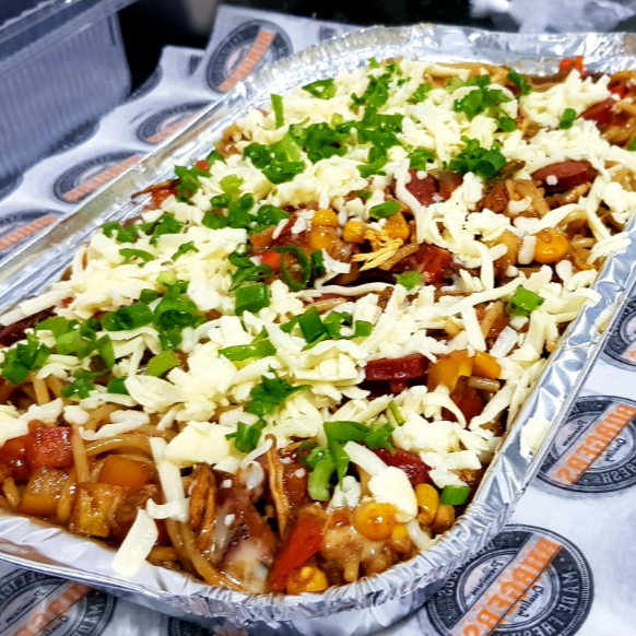 Macarrão Finalizado na Chapa com Molho de Alho e Shoyu, Frango Desfiado, Calabresa, Bacon, Queijo Mussarela, Milho, Tomate, Cebola, Pimentão e Cheiro Verde Aproximadamente 1kg