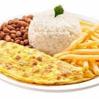 Arroz Branco ao Alho, Feijão Carioca, Batata Frita, Omelete com Queijo Mussarela, Salada do Dia... Acompanha Sobremesa Grátis (Salada enviada em potinho separado) (Formato da Batata Frita de Acordo com Nossa Disponibilidade do Dia)