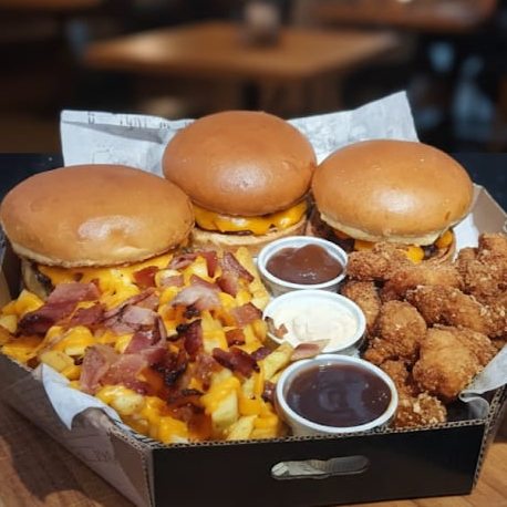 03 Smash Jr (Pão de Brioche, 2x Carne Artesanal 60g, Queijo Cheddar Cremoso e Cebola Caramelizada), Filé de Frango Empanado, Batata Frita + Grátis 03 Molhos da Casa (Ketchup, Molho Bbq e Maionese)