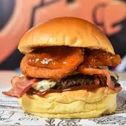 Pão Artesanal Selado na Manteiga, 2x Carne Artesanal 60g, Fatias Crocante de Bacon, Queijo Mussarela, Anéis de Cebola Empanados, Molho BBQ e Maionese Caseira de Bacon (Acompanha Batata Frita)