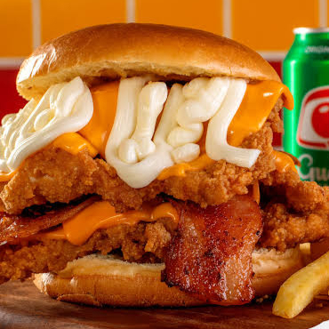 Pão Artesanal, Frango Empanado em Panko, Fatias de Bacon Crocante, Catupiry, Alface Americana, Tomate, Cebola Roxa e Molho Rosê da Casa (Acompanha Batata Frita) (O Pão Artesanal poderá ser com ou sem gergelim, depende da disponibilidade do Dia)