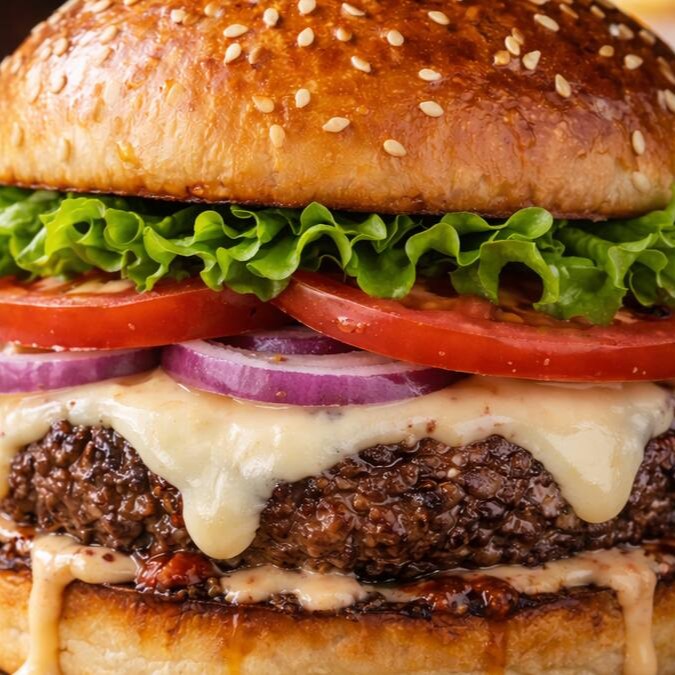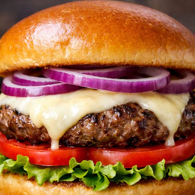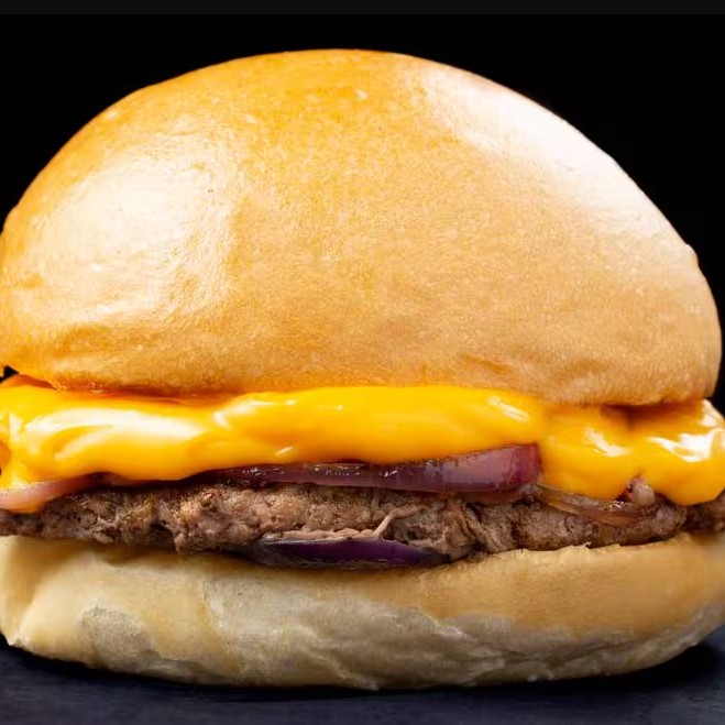 Pão Brioche, Blend 150gr, mussarela, cebola roxa, alface, tomate, molho americano.