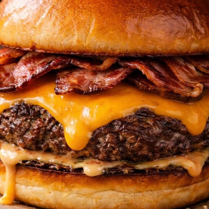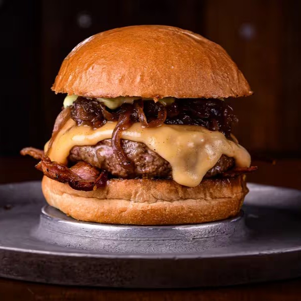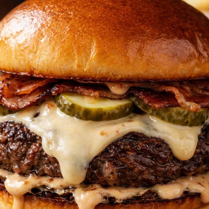 Pão Brioche, Blend 100gr, mussarela, pickles, bacon, molho americano.