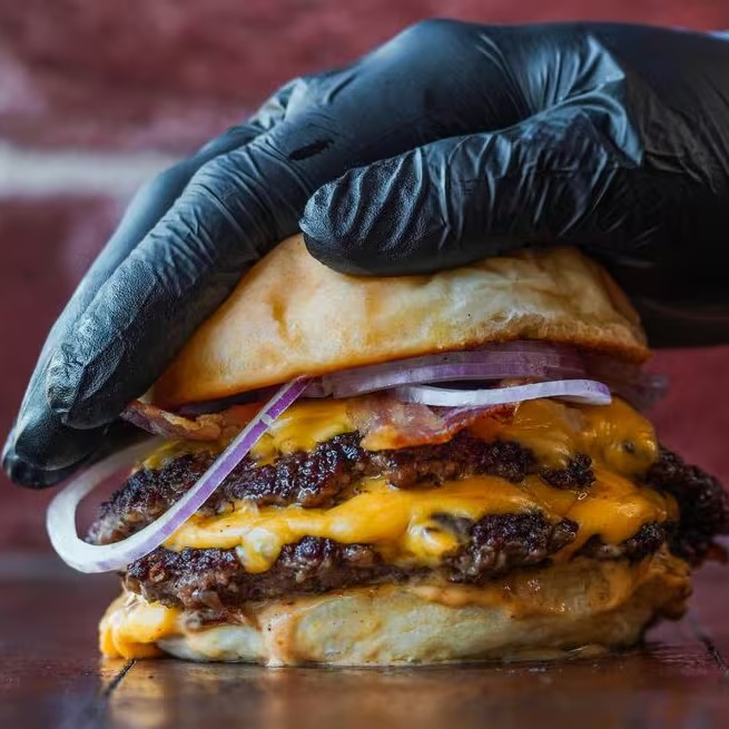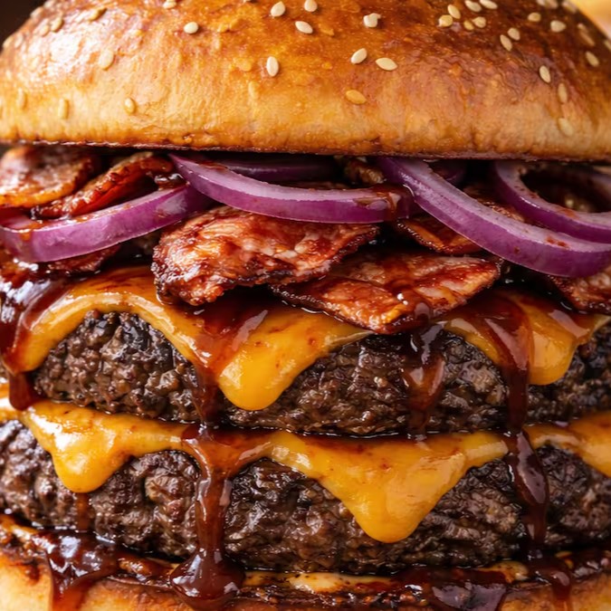 Pão australiano, 2 Blend 150gr, cheddar, cebola roxa, bacon, barbecue.