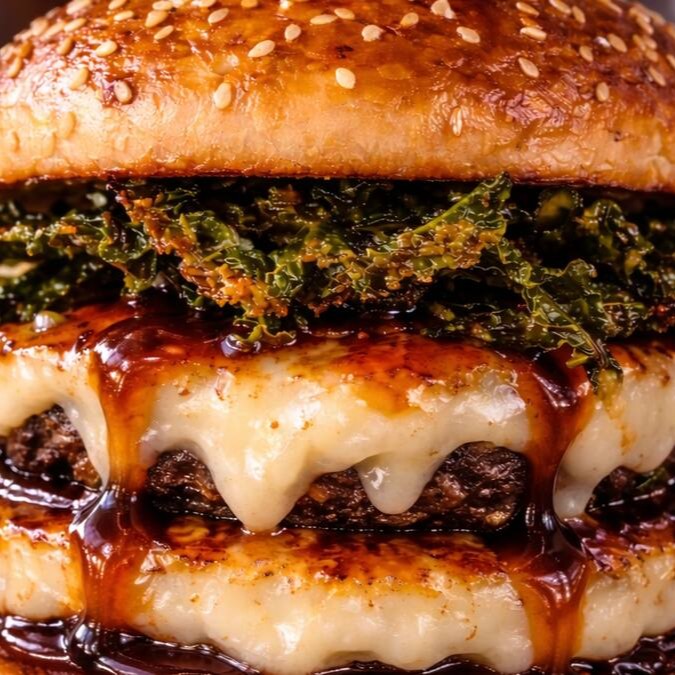 Pão Gergelim, Blend 150gr, queijo minas, bacon, crispy de couve, alho frito, barbecue. (Foto Ilustrativa)