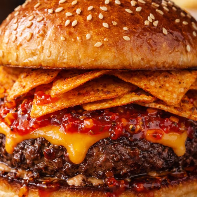 Pão Gergelim, Blend 150gr, cheddar, bacon, Doritos, geleia de pimenta.