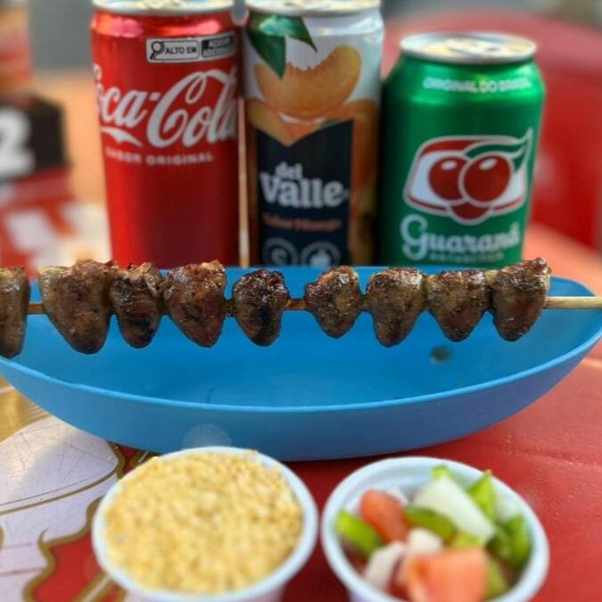 Delicioso coração de galinha assado na hora, acompanhado de farofa.