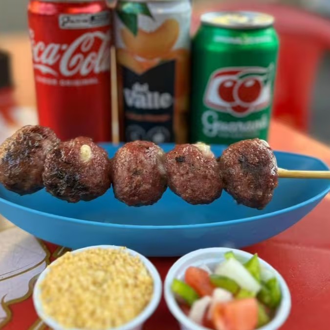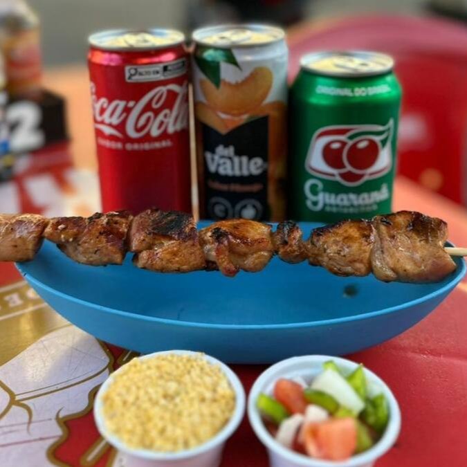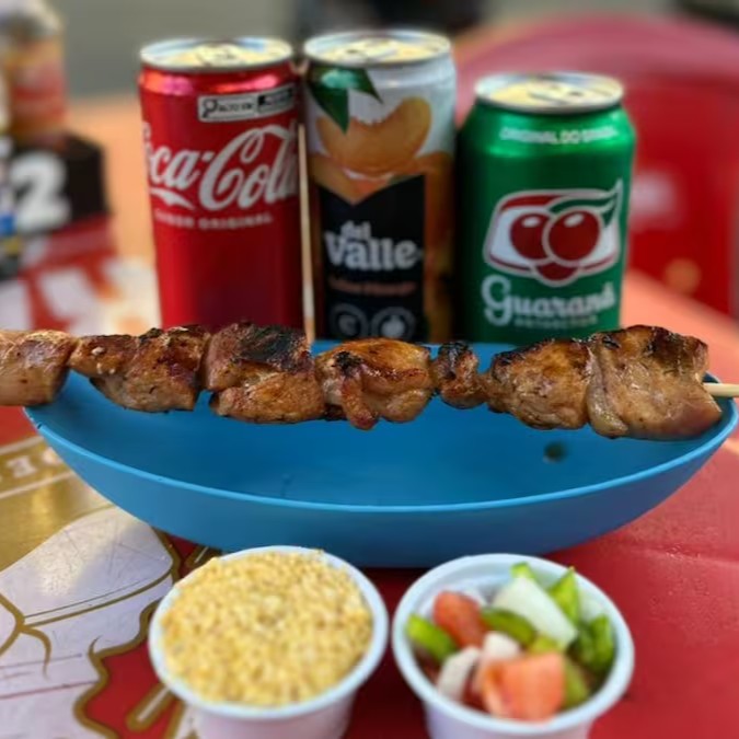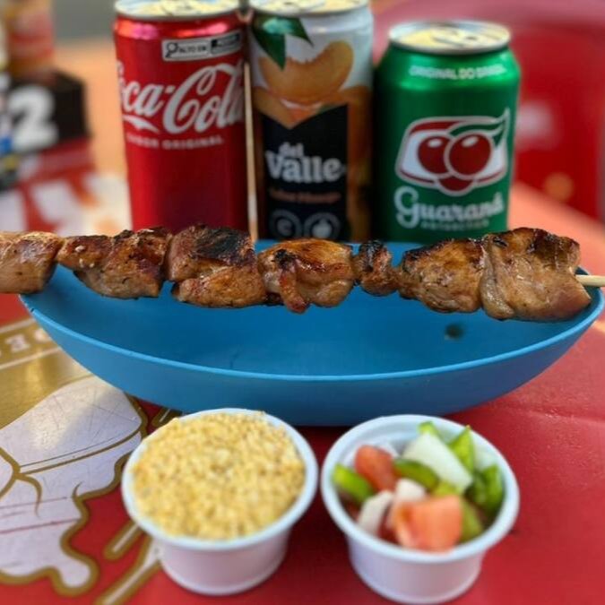 Delicioso espeto de almôndega com queijo suculento, assado na hora acompanhado de farofa temperada.