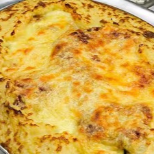 Contra filé à milanesa com purê de batatas, molho ao sugo e queijo. Acompanha arroz branco *Molho contém folha de manjericão*