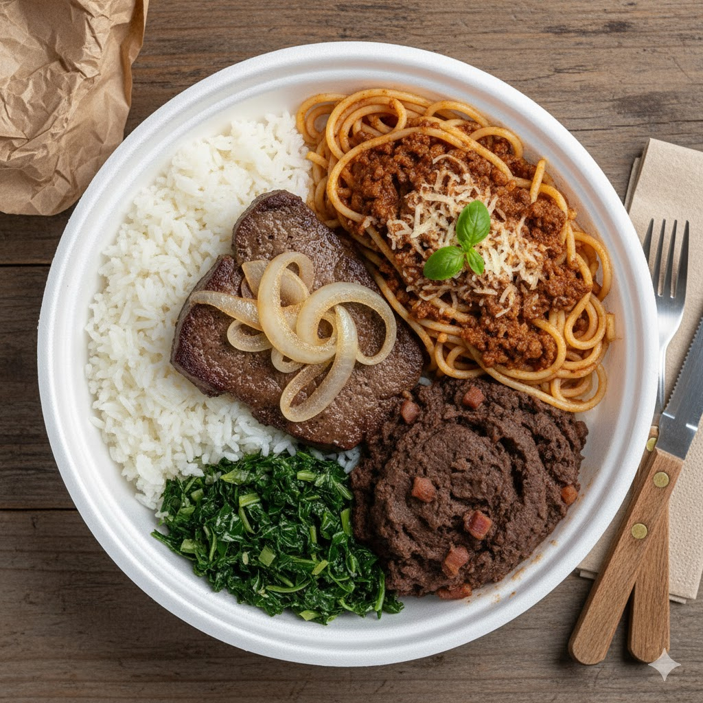 Acompanha arroz, tutu de feijão, couve e macarrão à bolonhesa