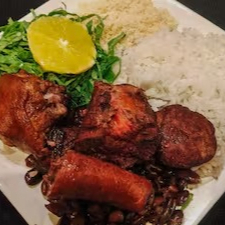 Feijoada completa com arroz, farofa de alho, couve e laranja