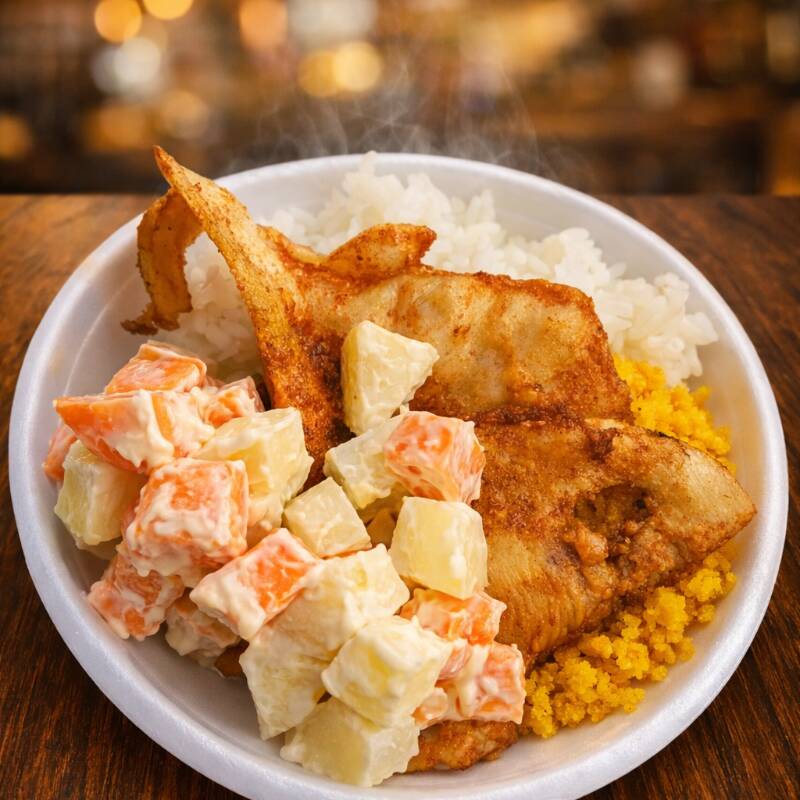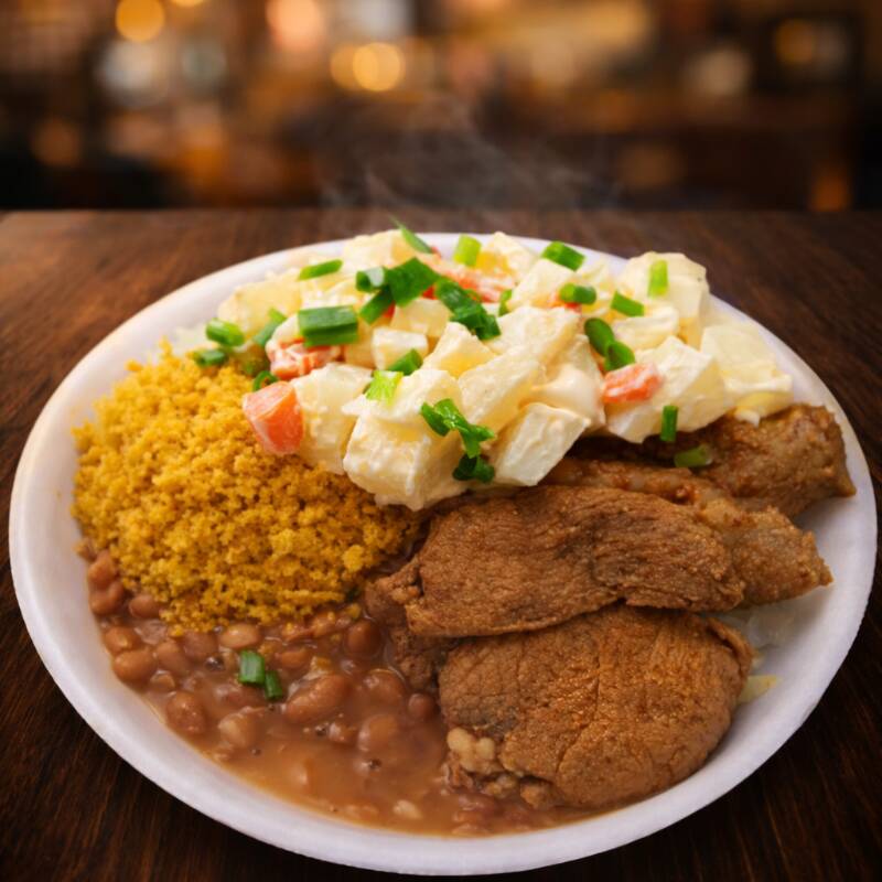 Arroz, Feijão, Bife De Pernil Acebolado, Maionese De Batata Com Cenoura, Farofa E