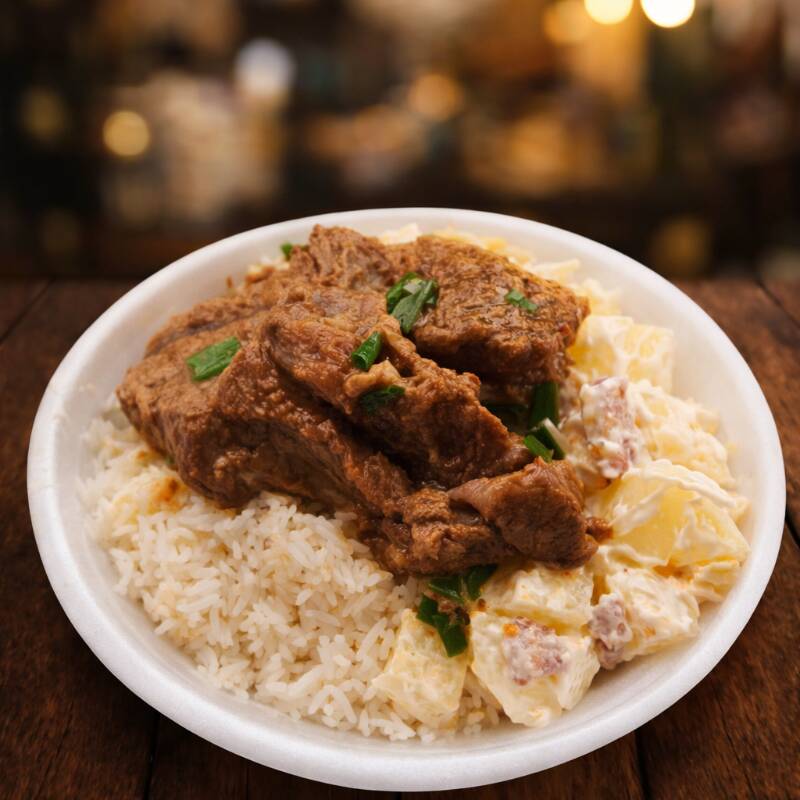 Arroz, Feijão, Bife De Pernil Acebolado, Maionese De Batata Com Cenoura, Farofa E Salada .