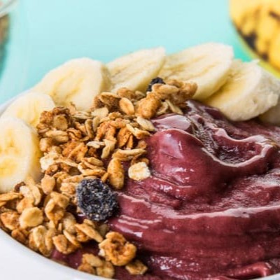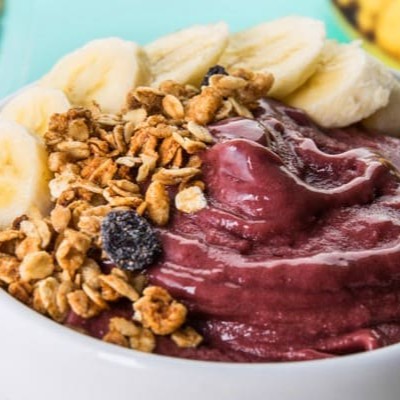 Açaí delicioso, escolha seus complementos: leite ou suco de laranja, morango, banana, granola e xarope